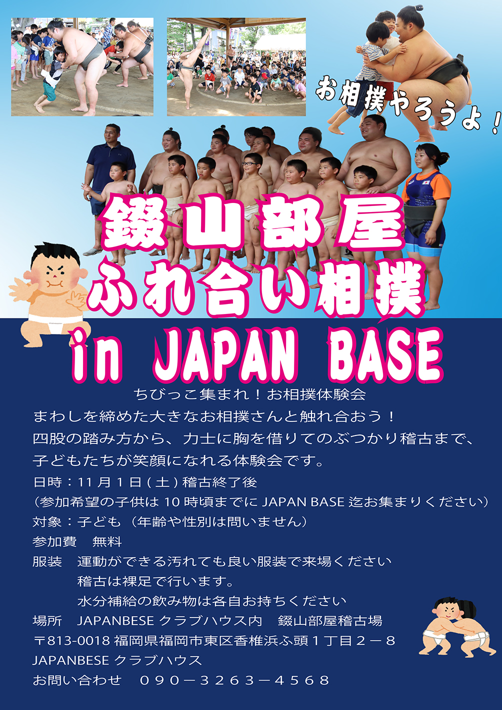 この度JAPAN BASEにて大相撲【錣山部屋】による、ふれ合い相撲が開催されることとなりましたのでお知らせいたします。